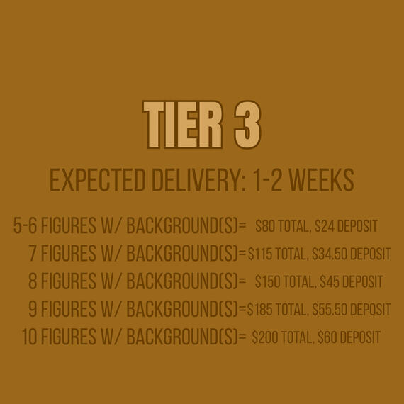 Every day I am late on the delivery time given, will be $5 off of your payment. (Example: for tier 1, you’d have $24.50 left to pay after the deposit. If I am late on delivery, you will only have to pay $19.50 to receive your order)